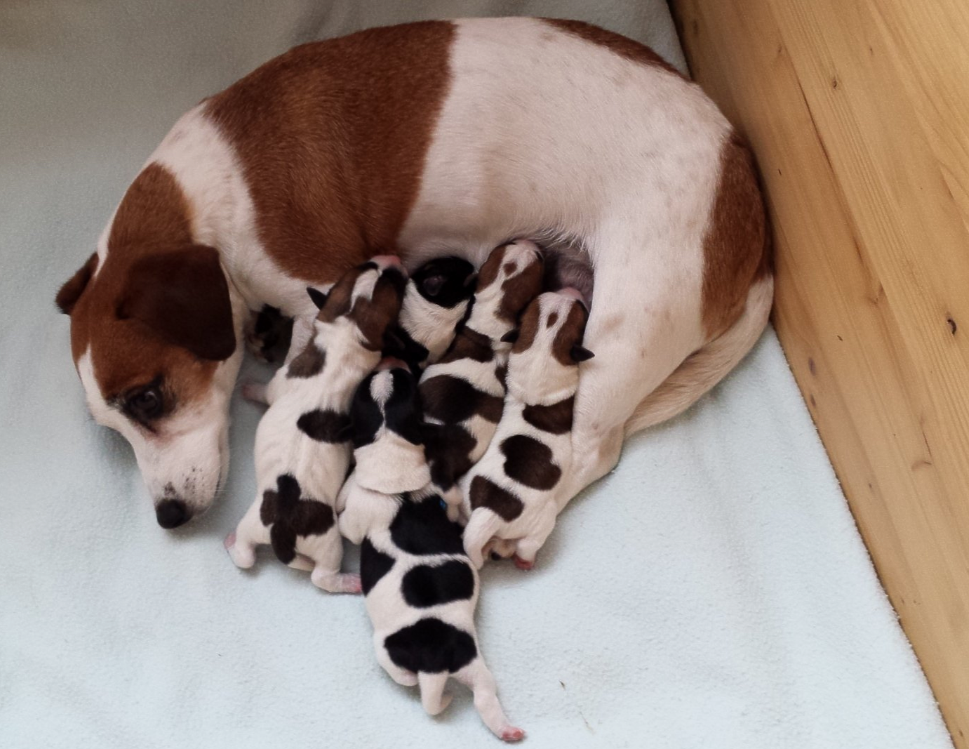 Die kleinen Racker sind fleißig auf den Beinchen unterwegs und aus der Wurfkiste ist das eine Wau oder Grrr zu hören. Die kleine Bande wird munter.